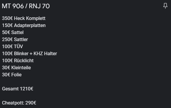 Das war meine erste Gliederung. Sie war grob und einfach, aber effektiv. Für den ersten Shoppingtrip sicher nicht schlecht, aber im Nachhinein doch etwas naiv. Bei der Kostenkalkulation handelte es sich um eine Google-Notiz auf meinem Handy. Immerhin gab es einen Topf, der für unvorhergesehene Ausgaben gedacht war. Auch wenn dieser selbst in zehnfacher Größe nicht ausgereicht hätte, aber das werden wir zu einem späteren Zeitpunkt noch zu genüge feststellen. Die ursprünglichen Projektnamen waren MT906 (MT09+R6). Oder RNJ70 (RN43+RJ27) in Anlehnung an die internen Modellbezeichnungen von Yamaha. Dass eine „geläufigere“ Version für den Namen gefunden werden musste, war schon damals klar.